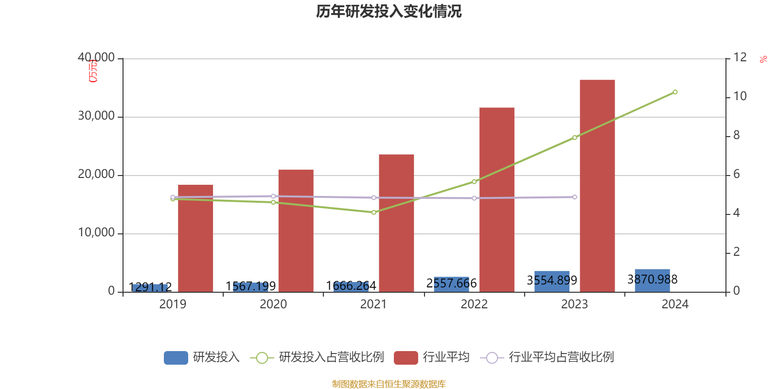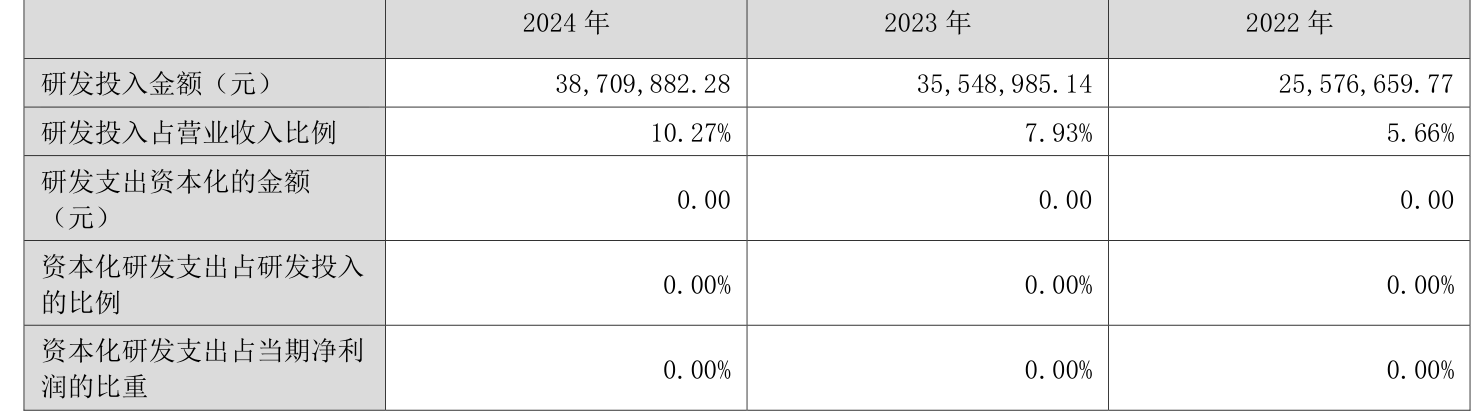 2024年全年,公司研发投入金额为3870.99万元,同比增长8.89%;研发投入占营业收入比例为10.27%,相比上年同期上升2.34个百分点。此外,公司全年研发投入资本化率为0%。