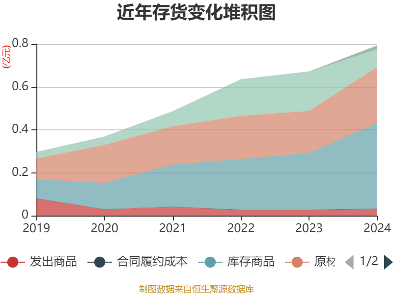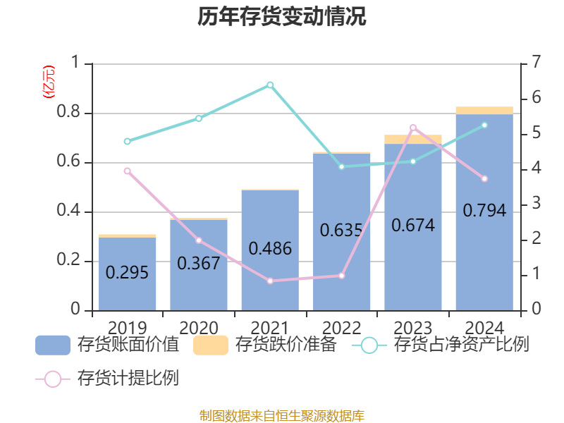 从存货变动来看,截至2024年末,公司存货账面价值为7935.28万元,占净资产的5.25%,较上年末增加1196.21万元。其中,存货跌价准备为307.24万元,计提比例为3.73%。