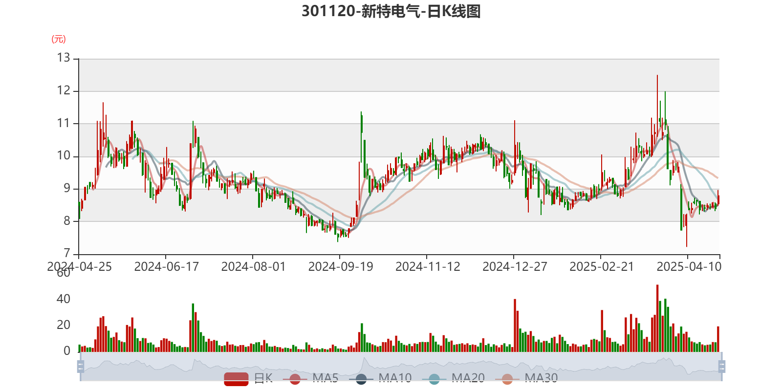 中证智能财讯新特电气(301120)4月25日披露2024年年度报告。2024年,公司实现营业总收入3.77亿元,同比下降15.88%;归母净利润亏损4851.16万元,上年同期盈利6936.21万元;扣非净利润亏损6031.39万元,上年同期盈利5760.85万元;经营活动产生的现金流量净额为4786.09万元,同比增长0.68%;报告期内,新特电气基本每股收益为-0.13元,加权平均净资产收益率为-3.09%。公司2024年度分配预案为:拟向全体股东每10股派现0.3元(含税)。