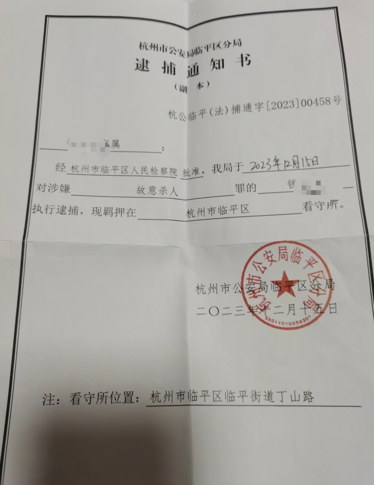 2023年12月15日,杭州市公安局临平区分局出具《逮捕通知书》,称经杭州市临平区人民检察院批准,对涉嫌故意杀人罪的钱某庆进行逮捕。