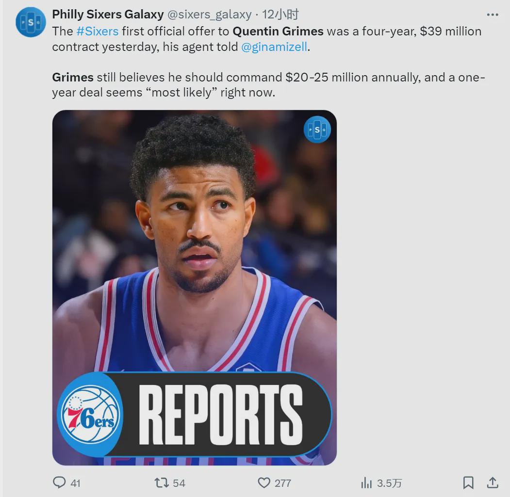 又一个球员续约谈崩了!76人随队记者Gina Mizell报道,格莱姆斯索要年薪2000万-2500万的合同,也就是4年8000万-4年1亿。但76人只开出4年3900万的续约报价,双方存在很大分歧。自由市场开启两个多月双悦网,76人只给他这一份报价。
