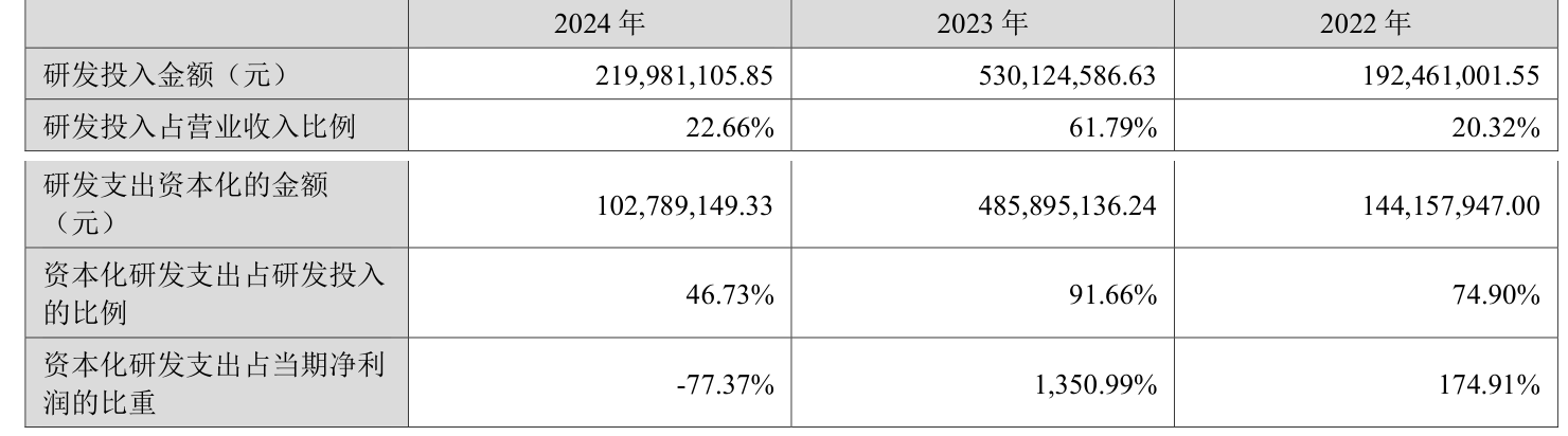 2024年全年,公司研发投入金额为2.2亿元,同比下降58.5%;研发投入占营业收入比例为22.66%,相比上年同期下降39.13个百分点。此外,公司全年研发投入资本化率为46.73%。