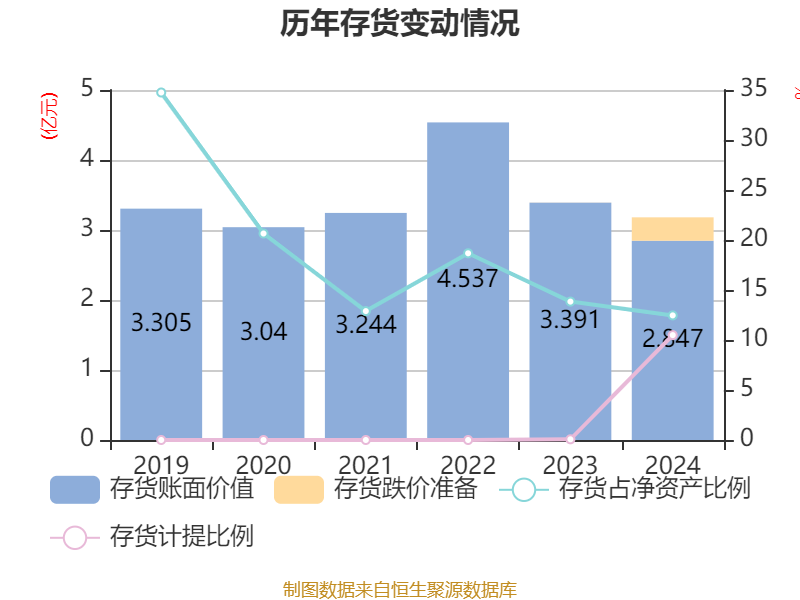 从存货变动来看,截至2024年末,公司存货账面价值为2.85亿元,占净资产的12.46%,较上年末减少5437.34万元。其中,存货跌价准备为3335.88万元,计提比例为10.49%。
