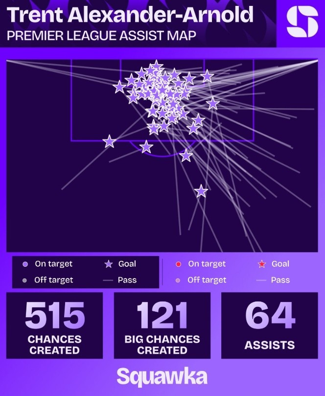 阿诺德以64次助攻成为英超历史助攻数最多的后卫,他也是英超历史单赛季送出助攻最多的后卫。另外,他还两次做到连续5场比赛在英超中送出助攻。